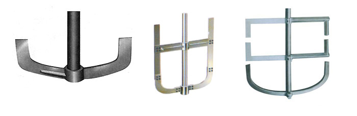 錨式、框式攪拌器屬于同一類,統稱錨框式攪拌器,該種攪拌器的葉輪槳徑對罐徑之比較大。使用于低粘度液體時,錨式葉輪的葉徑與罐徑比為0.7~0.9,對于高黏度液體則為0.8~0.95.轉速通常為10~50r/min。為了增大攪拌范圍和帶走罐壁上的殘留物或液層,錨框式攪拌器的外廓要接近攪拌罐的內壁,其底部的形狀為適應罐底的輪廓也有橢圓、錐形等。為了增大對高粘度物料的攪拌范圍以及提高葉輪的剛性,還常常要在錨式及框式上增加一些立葉和橫梁,這樣使得錨框式的結構形狀出現了多種多樣。 |